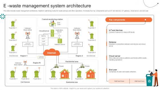 This slide includes waste management architecture, helpful in optimizing routes for waste pickups and other operations. It includes four key components such as IoT end devices, IoT gateway, cloud server, and end user. From laying roadmaps to briefing everything in detail, our templates are perfect for you. You can set the stage with your presentation slides. All you have to do is download these easy-to-edit and customizable templates. E Waste Management Step By Step Guide For Electronic Ppt Example will help you deliver an outstanding performance that everyone would remember and praise you for. Do download this presentation today. This slide includes waste management architecture, helpful in optimizing routes for waste pickups and other operations. It includes four key components such as IoT end devices, IoT gateway, cloud server, and end user.