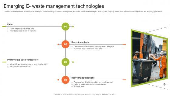 This slide includes potential technologies that integrate smart technologies in waste management processes. It includes technologies such as pello, recycling robots, solar powered trash compactors, and recycling applications. Present like a pro with Emerging E Waste Step By Step Guide For Electronic Ppt Template. Create beautiful presentations together with your team, using our easy-to-use presentation slides. Share your ideas in real-time and make changes on the fly by downloading our templates. So whether you are in the office, on the go, or in a remote location, you can stay in sync with your team and present your ideas with confidence. With Slidegeeks presentation got a whole lot easier. Grab these presentations today. This slide includes potential technologies that integrate smart technologies in waste management processes. It includes technologies such as pello, recycling robots, solar powered trash compactors, and recycling applications.