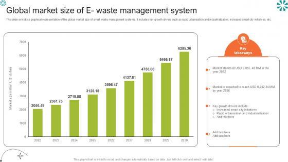 This slide exhibits a graphical representation of the global market size of smart waste management systems. It includes key growth drivers such as rapid urbanisation and industrialization, increased smart city initiatives, etc. If your project calls for a presentation, then Slidegeeks is your go-to partner because we have professionally designed, easy-to-edit templates that are perfect for any presentation. After downloading, you can easily edit Global Market Size Of E Waste Step By Step Guide For Electronic Ppt Example and make the changes accordingly. You can rearrange slides or fill them with different images. Check out all the handy templates This slide exhibits a graphical representation of the global market size of smart waste management systems. It includes key growth drivers such as rapid urbanisation and industrialization, increased smart city initiatives, etc.