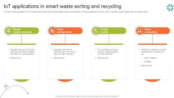 This slide exhibits applications of IoT that help waste sorting and recycling facilities operate more efficiently. It includes applications such as waste composition, waste sorting robots, and quality control. Formulating a presentation can take up a lot of effort and time, so the content and message should always be the primary focus. The visuals of the PowerPoint can enhance the presenters message, so our Iot Applications In Smart Waste Step By Step Guide For Electronic Ppt Sample was created to help save time. Instead of worrying about the design, the presenter can concentrate on the message while our designers work on creating the ideal templates for whatever situation is needed. Slidegeeks has experts for everything from amazing designs to valuable content, we have put everything into Iot Applications In Smart Waste Step By Step Guide For Electronic Ppt Sample This slide exhibits applications of IoT that help waste sorting and recycling facilities operate more efficiently. It includes applications such as waste composition, waste sorting robots, and quality control.