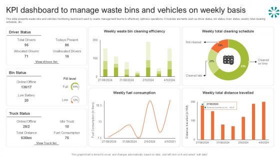 This slide presents waste bins and vehicles monitoring dashboard used by waste management teams to effectively optimize operations. It includes elements such as driver status, bin status, truck status, weekly total cleaning schedule, etc. This Kpi Dashboard To Manage Waste Step By Step Guide For Electronic Ppt Template is perfect for any presentation, be it in front of clients or colleagues. It is a versatile and stylish solution for organizing your meetings. The Kpi Dashboard To Manage Waste Step By Step Guide For Electronic Ppt Template features a modern design for your presentation meetings. The adjustable and customizable slides provide unlimited possibilities for acing up your presentation. Slidegeeks has done all the homework before launching the product for you. So, do not wait, grab the presentation templates today This slide presents waste bins and vehicles monitoring dashboard used by waste management teams to effectively optimize operations. It includes elements such as driver status, bin status, truck status, weekly total cleaning schedule, etc.
