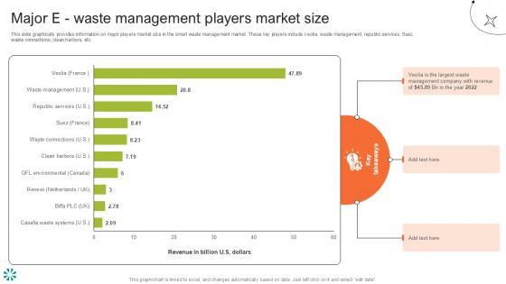 This slide graphically provides information on major players market size in the smart waste management market. These key players include Veolia, waste management, republic services, Suez, waste connections, clean harbors, etc.Welcome to our selection of the Major E Waste Management Step By Step Guide For Electronic Ppt Template. These are designed to help you showcase your creativity and bring your sphere to life. Planning and Innovation are essential for any business that is just starting out. This collection contains the designs that you need for your everyday presentations. All of our PowerPoints are 100Percent editable, so you can customize them to suit your needs. This multi-purpose template can be used in various situations. Grab these presentation templates today. This slide graphically provides information on major players market size in the smart waste management market. These key players include Veolia, waste management, republic services, Suez, waste connections, clean harbors, etc.