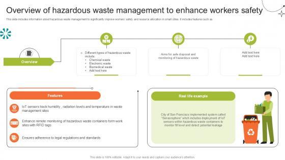 This slide includes information about hazardous waste management to significantly improve workers safety and resource allocation in smart cities. It includes features such as.Retrieve professionally designed Overview Of Hazardous Waste Step By Step Guide For Electronic Ppt PowerPoint to effectively convey your message and captivate your listeners. Save time by selecting pre-made slideshows that are appropriate for various topics, from business to educational purposes. These themes come in many different styles, from creative to corporate, and all of them are easily adjustable and can be edited quickly. Access them as PowerPoint templates or as Google Slides themes. You do not have to go on a hunt for the perfect presentation because Slidegeeks got you covered from everywhere. This slide includes information about hazardous waste management to significantly improve workers safety and resource allocation in smart cities. It includes features such as.