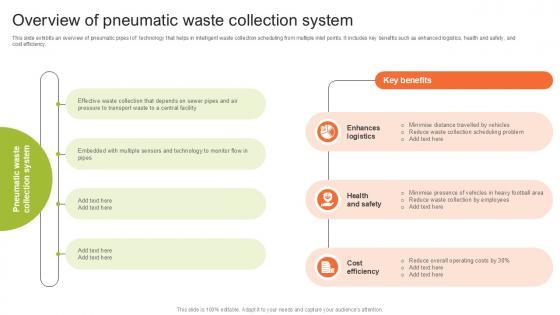 This slide exhibits an overview of pneumatic pipes IoT technology that helps in intelligent waste collection scheduling from multiple inlet points. It includes key benefits such as enhanced logistics, health and safety, and cost efficiency. Slidegeeks has constructed Overview Of Pneumatic Waste Collection Step By Step Guide For Electronic Ppt Template after conducting extensive research and examination. These presentation templates are constantly being generated and modified based on user preferences and critiques from editors. Here, you will find the most attractive templates for a range of purposes while taking into account ratings and remarks from users regarding the content. This is an excellent jumping-off point to explore our content and will give new users an insight into our top-notch PowerPoint Templates. This slide exhibits an overview of pneumatic pipes IoT technology that helps in intelligent waste collection scheduling from multiple inlet points. It includes key benefits such as enhanced logistics, health and safety, and cost efficiency.