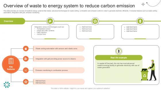 This slide provides an overview of waste-to-energy systems that employ advanced technologies for waste sorting, combustion and emission control in order to generate electricity efficiently. It includes features such as waste sorting automation, integration with grid, emission monitoring. Take your projects to the next level with our ultimate collection of Overview Of Waste To Energy Step By Step Guide For Electronic Ppt Template. Slidegeeks has designed a range of layouts that are perfect for representing task or activity duration, keeping track of all your deadlines at a glance. Tailor these designs to your exact needs and give them a truly corporate look with your own brand colors they will make your projects stand out from the rest This slide provides an overview of waste to energy systems that employ advanced technologies for waste sorting, combustion and emission control in order to generate electricity efficiently. It includes features such as waste sorting automation, integration with grid, emission monitoring.