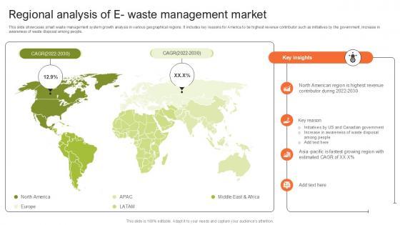 This slide showcases smart waste management system growth analysis in various geographical regions. It includes key reasons for America to be highest revenue contributor such as initiatives by the government, increase in awareness of waste disposal among people.Do you know about Slidesgeeks Regional Analysis Of E Waste Step By Step Guide For Electronic Ppt Slide These are perfect for delivering any kind od presentation. Using it, create PowerPoint presentations that communicate your ideas and engage audiences. Save time and effort by using our pre-designed presentation templates that are perfect for a wide range of topic. Our vast selection of designs covers a range of styles, from creative to business, and are all highly customizable and easy to edit. Download as a PowerPoint template or use them as Google Slides themes. This slide showcases smart waste management system growth analysis in various geographical regions. It includes key reasons for America to be highest revenue contributor such as initiatives by the government, increase in awareness of waste disposal among people.