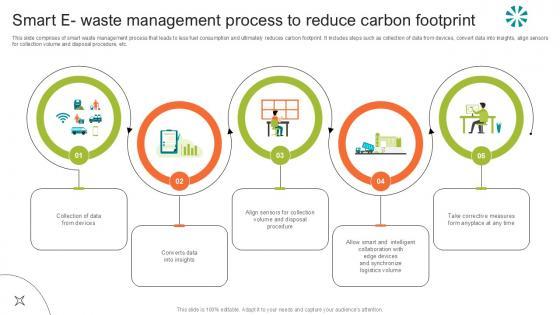 This slide comprises of smart waste management process that leads to less fuel consumption and ultimately reduces carbon footprint. It includes steps such as collection of data from devices, convert data into insights, align sensors for collection volume and disposal procedure, etc. Boost your pitch with our creative Smart E Waste Management Process Step By Step Guide For Electronic Ppt PowerPoint. Deliver an awe-inspiring pitch that will mesmerize everyone. Using these presentation templates you will surely catch everyones attention. You can browse the ppts collection on our website. We have researchers who are experts at creating the right content for the templates. So you do not have to invest time in any additional work. Just grab the template now and use them. This slide comprises of smart waste management process that leads to less fuel consumption and ultimately reduces carbon footprint. It includes steps such as collection of data from devices, convert data into insights, align sensors for collection volume and disposal procedure, etc.
