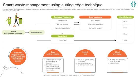 This slide exhibits block diagram of a smart waste management and classification system using various technologies for efficient waste collection, sorting, and disposal. It includes main stages such as edge node processing, cloud processing, and control unit. Slidegeeks is one of the best resources for PowerPoint templates. You can download easily and regulate Smart Waste Management Using Step By Step Guide For Electronic Ppt Sample for your personal presentations from our wonderful collection. A few clicks is all it takes to discover and get the most relevant and appropriate templates. Use our Templates to add a unique zing and appeal to your presentation and meetings. All the slides are easy to edit and you can use them even for advertisement purposes. This slide exhibits block diagram of a smart waste management and classification system using various technologies for efficient waste collection, sorting, and disposal. It includes main stages such as edge node processing, cloud processing, and control unit.