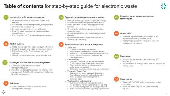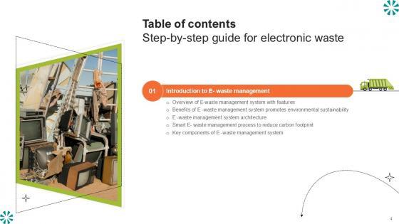 Do you have to make sure that everyone on your team knows about any specific topic I yes, then you should give Table Of Contents Step By Step Guide For Electronic Waste Ppt Sample a try. Our experts have put a lot of knowledge and effort into creating this impeccable Table Of Contents Step By Step Guide For Electronic Waste Ppt Sample. You can use this template for your upcoming presentations, as the slides are perfect to represent even the tiniest detail. You can download these templates from the Slidegeeks website and these are easy to edit. So grab these today Our Table Of Contents Step By Step Guide For Electronic Waste Ppt Sample are topically designed to provide an attractive backdrop to any subject. Use them to look like a presentation pro.