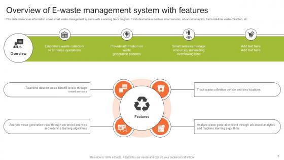 This slide showcases information about smart waste management systems with a working block diagram. It includes features such as smart sensors, advanced analytics, track real-time waste collection, etc. The best PPT templates are a great way to save time, energy, and resources. Slidegeeks have 100 percent editable powerpoint slides making them incredibly versatile. With these quality presentation templates, you can create a captivating and memorable presentation by combining visually appealing slides and effectively communicating your message. Download Overview Of E Waste Management Step By Step Guide For Electronic Ppt Presentation from Slidegeeks and deliver a wonderful presentation. This slide showcases information about smart waste management systems with a working block diagram. It includes features such as smart sensors, advanced analytics, track real time waste collection, etc.