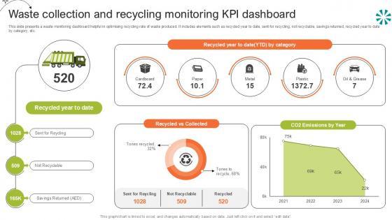 This slide presents a waste monitoring dashboard helpful in optimising recycling rate of waste produced. It includes elements such as recycled year to date, sent for recycling, not recyclable, savings returned, recycled year to date by category, etc. From laying roadmaps to briefing everything in detail, our templates are perfect for you. You can set the stage with your presentation slides. All you have to do is download these easy-to-edit and customizable templates. Waste Collection And Recycling Step By Step Guide For Electronic Ppt PowerPoint will help you deliver an outstanding performance that everyone would remember and praise you for. Do download this presentation today. This slide presents a waste monitoring dashboard helpful in optimising recycling rate of waste produced. It includes elements such as recycled year to date, sent for recycling, not recyclable, savings returned, recycled year to date by category, etc.