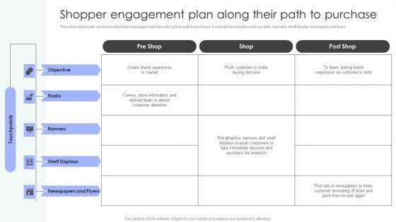 This slide represents various touchpoints to engage customers along their path to purchase. It include touchpoints such as radio, banners, shelf display, newspaper and flyers. Slidegeeks is one of the best resources for PowerPoint templates. You can download easily and regulate Shopper Marketing Strategy To Enhance Shopper Engagement Plan Along Their Path Elements Pdf for your personal presentations from our wonderful collection. A few clicks is all it takes to discover and get the most relevant and appropriate templates. Use our Templates to add a unique zing and appeal to your presentation and meetings. All the slides are easy to edit and you can use them even for advertisement purposes. This slide represents various touchpoints to engage customers along their path to purchase. It include touchpoints such as radio, banners, shelf display, newspaper and flyers.