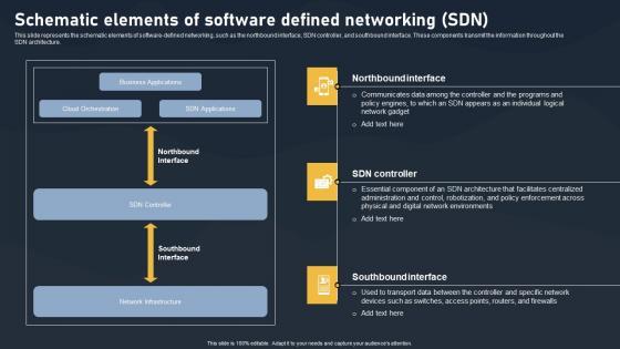 This slide represents the schematic elements of software-defined networking, such as the northbound interface, SDN controller, and southbound interface. These components transmit the information throughout the SDN architecture.This Deploying SDN System Schematic Elements Of Software Defined Networking SDN Microsoft PDF is perfect for any presentation, be it in front of clients or colleagues. It is a versatile and stylish solution for organizing your meetings. The Deploying SDN System Schematic Elements Of Software Defined Networking SDN Microsoft PDF features a modern design for your presentation meetings. The adjustable and customizable slides provide unlimited possibilities for acing up your presentation. Slidegeeks has done all the homework before launching the product for you. So, dont wait, grab the presentation templates today.