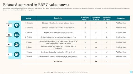Following slide comprises of balanced scorecard of an airline in ERRC eliminate raise reduce create strategy canvas to review and rate its performance with respect to its competitors. The elements are scores of the company and competitors on the basis of actions such as eliminate free food, reduce waiting time etc. Showcasing this set of slides titled Balanced Scorecard In Errc Value Canvas Elements Pdf. The topics addressed in these templates are Balanced Scorecard, Strategy Canvas, Competitors, Reduce Waiting Time. All the content presented in this PPT design is completely editable. Download it and make adjustments in color, background, font etc. as per your unique business setting. Following slide comprises of balanced scorecard of an airline in ERRC eliminate raise reduce create strategy canvas to review and rate its performance with respect to its competitors. The elements are scores of the company and competitors on the basis of actions such as eliminate free food, reduce waiting time etc.