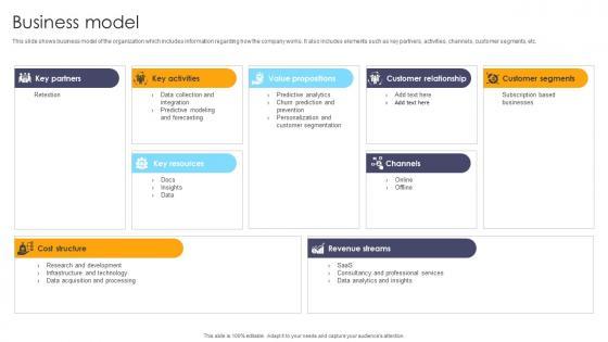 This slide shows business model of the organization which includes information regarding how the company works. It also includes elements such as key partners, activities, channels, customer segments, etc. Boost your pitch with our creative Business Model Customer Experience Management Company Investor Funding Elevator Pitch Deck. Deliver an awe-inspiring pitch that will mesmerize everyone. Using these presentation templates you will surely catch everyones attention. You can browse the ppts collection on our website. We have researchers who are experts at creating the right content for the templates. So you do not have to invest time in any additional work. Just grab the template now and use them. This slide shows business model of the organization which includes information regarding how the company works. It also includes elements such as key partners, activities, channels, customer segments, etc.