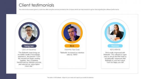 This slide shows reviews given by customers after using the services provided by the company which can help investors to get an idea regarding the software performance. Create an editable Client Testimonials Customer Experience Management Company Investor Funding Elevator Pitch Deck that communicates your idea and engages your audience. Whether you are presenting a business or an educational presentation, pre-designed presentation templates help save time. Client Testimonials Customer Experience Management Company Investor Funding Elevator Pitch Deck is highly customizable and very easy to edit, covering many different styles from creative to business presentations. Slidegeeks has creative team members who have crafted amazing templates. So, go and get them without any delay. This slide shows reviews given by customers after using the services provided by the company which can help investors to get an idea regarding the software performance.
