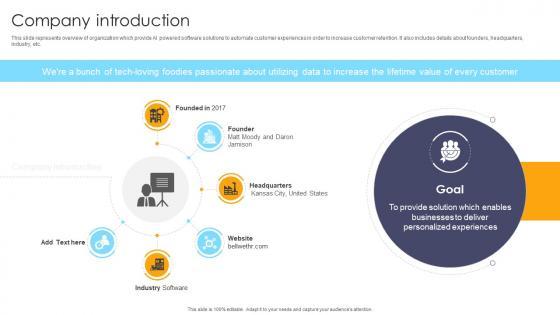 This slide represents overview of organization which provide AI powered software solutions to automate customer experiences in order to increase customer retention. It also includes details about founders, headquarters, industry, etc. Slidegeeks is one of the best resources for PowerPoint templates. You can download easily and regulate Company Introduction Customer Experience Management Company Investor Funding Elevator Pitch Deck for your personal presentations from our wonderful collection. A few clicks is all it takes to discover and get the most relevant and appropriate templates. Use our Templates to add a unique zing and appeal to your presentation and meetings. All the slides are easy to edit and you can use them even for advertisement purposes. This slide represents overview of organization which provide AI powered software solutions to automate customer experiences in order to increase customer retention. It also includes details about founders, headquarters, industry, etc.