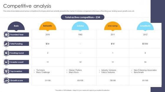 This slide shows details about various competitors of company which are currently present in the market. It includes comparison on the basis of founding year, funding raised, growth score, etc. Want to ace your presentation in front of a live audience Our Competitive Analysis Customer Experience Management Company Investor Funding Elevator Pitch Deck can help you do that by engaging all the users towards you. Slidegeeks experts have put their efforts and expertise into creating these impeccable powerpoint presentations so that you can communicate your ideas clearly. Moreover, all the templates are customizable, and easy-to-edit and downloadable. Use these for both personal and commercial use. This slide shows details about various competitors of company which are currently present in the market. It includes comparison on the basis of founding year, funding raised, growth score, etc.