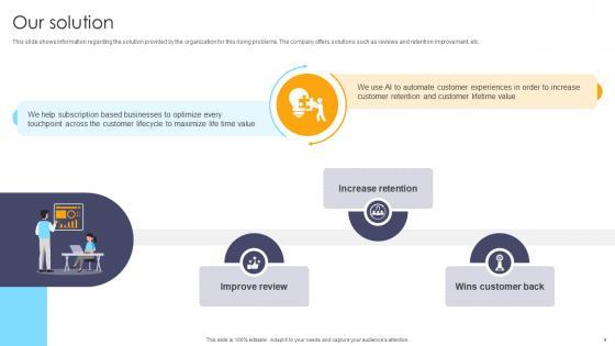This slide shows information regarding the solution provided by the organization for this rising problems. The company offers solutions such as reviews and retention improvement, etc. Crafting an eye-catching presentation has never been more straightforward. Let your presentation shine with this tasteful yet straightforward Our Solution Customer Experience Management Company Investor Funding Elevator Pitch Deck template. It offers a minimalistic and classy look that is great for making a statement. The colors have been employed intelligently to add a bit of playfulness while still remaining professional. Construct the ideal Our Solution Customer Experience Management Company Investor Funding Elevator Pitch Deck that effortlessly grabs the attention of your audience Begin now and be certain to wow your customers This slide shows information regarding the solution provided by the organization for this rising problems. The company offers solutions such as reviews and retention improvement, etc.