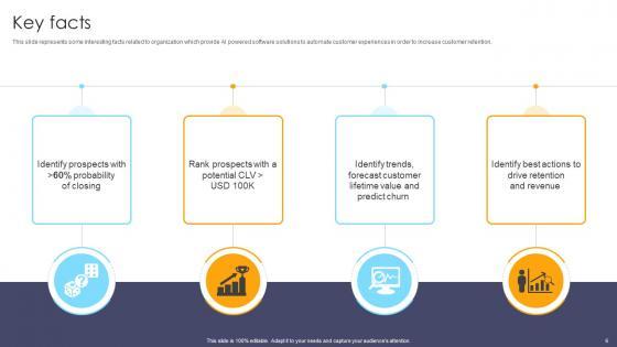 This slide represents some interesting facts related to organization which provide AI powered software solutions to automate customer experiences in order to increase customer retention. Find highly impressive Key Facts Customer Experience Management Company Investor Funding Elevator Pitch Deck on Slidegeeks to deliver a meaningful presentation. You can save an ample amount of time using these presentation templates. No need to worry to prepare everything from scratch because Slidegeeks experts have already done a huge research and work for you. You need to download Key Facts Customer Experience Management Company Investor Funding Elevator Pitch Deck for your upcoming presentation. All the presentation templates are 100 percent editable and you can change the color and personalize the content accordingly. Download now This slide represents some interesting facts related to organization which provide AI powered software solutions to automate customer experiences in order to increase customer retention.