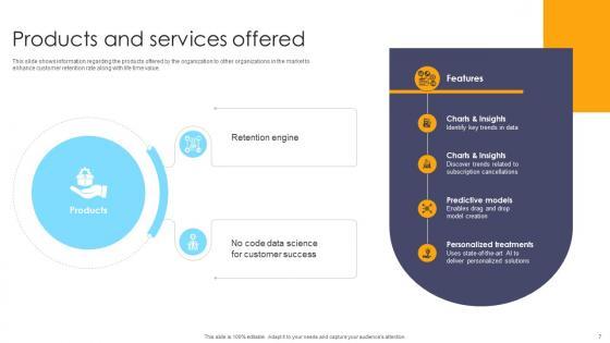 This slide shows information regarding the products offered by the organization to other organizations in the market to enhance customer retention rate along with life time value. Formulating a presentation can take up a lot of effort and time, so the content and message should always be the primary focus. The visuals of the PowerPoint can enhance the presenters message, so our Products And Services Offered Customer Experience Management Company Investor Funding Elevator Pitch Deck was created to help save time. Instead of worrying about the design, the presenter can concentrate on the message while our designers work on creating the ideal templates for whatever situation is needed. Slidegeeks has experts for everything from amazing designs to valuable content, we have put everything into Products And Services Offered Customer Experience Management Company Investor Funding Elevator Pitch Deck. This slide shows information regarding the products offered by the organization to other organizations in the market to enhance customer retention rate along with life time value.