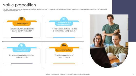 This slide shows information regarding the unique selling preposition offered by the organization to its customers for better experience. It includes predictive analytics, churn prediction and prevention, personalization, etc. Welcome to our selection of the Value Proposition Customer Experience Management Company Investor Funding Elevator Pitch Deck. These are designed to help you showcase your creativity and bring your sphere to life. Planning and Innovation are essential for any business that is just starting out. This collection contains the designs that you need for your everyday presentations. All of our PowerPoints are 100Percent editable, so you can customize them to suit your needs. This multi-purpose template can be used in various situations. Grab these presentation templates today. This slide shows information regarding the unique selling preposition offered by the organization to its customers for better experience. It includes predictive analytics, churn prediction and prevention, personalization, etc.