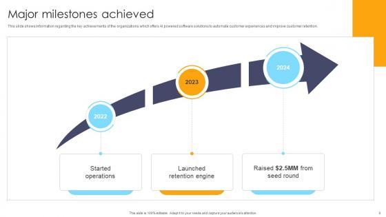 This slide shows information regarding the key achievements of the organizations which offers AI powered software solutions to automate customer experiences and improve customer retention. If your project calls for a presentation, then Slidegeeks is your go-to partner because we have professionally designed, easy-to-edit templates that are perfect for any presentation. After downloading, you can easily edit Major Milestones Achieved Customer Experience Management Company Investor Funding Elevator Pitch Deck and make the changes accordingly. You can rearrange slides or fill them with different images. Check out all the handy templates This slide shows information regarding the key achievements of the organizations which offers AI powered software solutions to automate customer experiences and improve customer retention.
