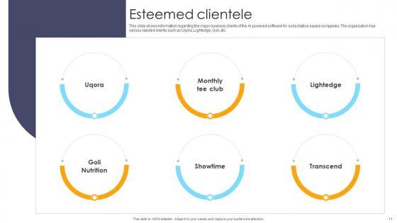 This slide shows information regarding the major business clients of the AI powered software for subscription based companies. The organization has various reputed clients such as Uqora, Lightedge, Goli, etc. Do you have to make sure that everyone on your team knows about any specific topic I yes, then you should give Esteemed Clientele Customer Experience Management Company Investor Funding Elevator Pitch Deck a try. Our experts have put a lot of knowledge and effort into creating this impeccable Esteemed Clientele Customer Experience Management Company Investor Funding Elevator Pitch Deck. You can use this template for your upcoming presentations, as the slides are perfect to represent even the tiniest detail. You can download these templates from the Slidegeeks website and these are easy to edit. So grab these today This slide shows information regarding the major business clients of the AI powered software for subscription based companies. The organization has various reputed clients such as Uqora, Lightedge, Goli, etc.