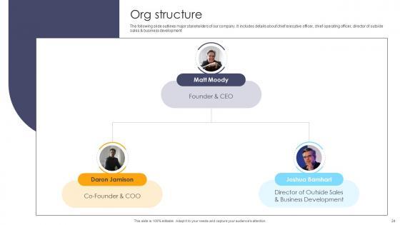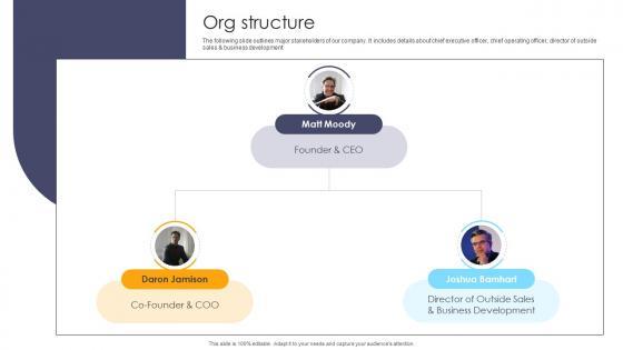 The following slide outlines major stakeholders of our company. It includes details about chief executive officer, chief operating officer, director of outside sales and business development. Are you in need of a template that can accommodate all of your creative concepts This one is crafted professionally and can be altered to fit any style. Use it with Google Slides or PowerPoint. Include striking photographs, symbols, depictions, and other visuals. Fill, move around, or remove text boxes as desired. Test out color palettes and font mixtures. Edit and save your work, or work with colleagues. Download Org Structure Customer Experience Management Company Investor Funding Elevator Pitch Deck and observe how to make your presentation outstanding. Give an impeccable presentation to your group and make your presentation unforgettable. The following slide outlines major stakeholders of our company. It includes details about chief executive officer, chief operating officer, director of outside sales and business development.