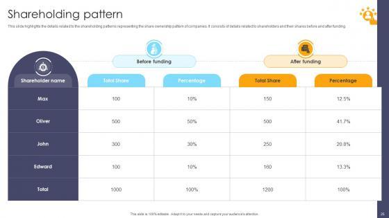 This slide highlights the details related to the shareholding patterns representing the share ownership pattern of companies. It consists of details related to shareholders and their shares before and after funding. This modern and well-arranged Shareholding Pattern Customer Experience Management Company Investor Funding Elevator Pitch Deck provides lots of creative possibilities. It is very simple to customize and edit with the Powerpoint Software. Just drag and drop your pictures into the shapes. All facets of this template can be edited with Powerpoint, no extra software is necessary. Add your own material, put your images in the places assigned for them, adjust the colors, and then you can show your slides to the world, with an animated slide included. This slide highlights the details related to the shareholding patterns representing the share ownership pattern of companies. It consists of details related to shareholders and their shares before and after funding.