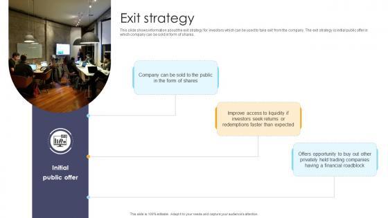 This slide shows information about the exit strategy for investors which can be used to take exit from the company. The exit strategy is initial public offer in which company can be sold in form of shares. Get a simple yet stunning designed Exit Strategy Customer Experience Management Company Investor Funding Elevator Pitch Deck. It is the best one to establish the tone in your meetings. It is an excellent way to make your presentations highly effective. So, download this PPT today from Slidegeeks and see the positive impacts. Our easy-to-edit Exit Strategy Customer Experience Management Company Investor Funding Elevator Pitch Deck can be your go-to option for all upcoming conferences and meetings. So, what are you waiting for Grab this template today. This slide shows information about the exit strategy for investors which can be used to take exit from the company. The exit strategy is initial public offer in which company can be sold in form of shares.