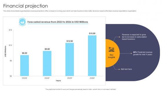 This slide shows details regarding future revenue projections of the company in coming years which can help investors to take better decisions based on the future revenue expectations organization. Present like a pro with Financial Projection Customer Experience Management Company Investor Funding Elevator Pitch Deck. Create beautiful presentations together with your team, using our easy-to-use presentation slides. Share your ideas in real-time and make changes on the fly by downloading our templates. So whether you are in the office, on the go, or in a remote location, you can stay in sync with your team and present your ideas with confidence. With Slidegeeks presentation got a whole lot easier. Grab these presentations today. This slide shows details regarding future revenue projections of the company in coming years which can help investors to take better decisions based on the future revenue expectations organization.