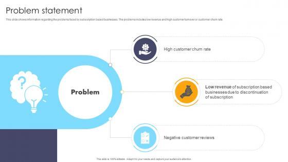 This slide shows information regarding the problems faced by subscription based businesses. The problems includes low revenue and high customer turnover or customer churn rate. Make sure to capture your audiences attention in your business displays with our gratis customizable Problem Statement Customer Experience Management Company Investor Funding Elevator Pitch Deck. These are great for business strategies, office conferences, capital raising or task suggestions. If you desire to acquire more customers for your tech business and ensure they stay satisfied, create your own sales presentation with these plain slides. This slide shows information regarding the problems faced by subscription based businesses. The problems includes low revenue and high customer turnover or customer churn rate.
