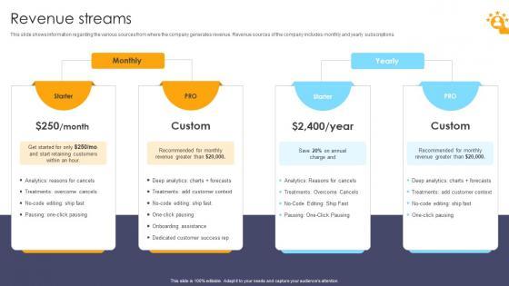 This slide shows information regarding the various sources from where the company generates revenue. Revenue sources of the company includes monthly and yearly subscriptions. Coming up with a presentation necessitates that the majority of the effort goes into the content and the message you intend to convey. The visuals of a PowerPoint presentation can only be effective if it supplements and supports the story that is being told. Keeping this in mind our experts created Revenue Streams Customer Experience Management Company Investor Funding Elevator Pitch Deck to reduce the time that goes into designing the presentation. This way, you can concentrate on the message while our designers take care of providing you with the right template for the situation. This slide shows information regarding the various sources from where the company generates revenue. Revenue sources of the company includes monthly and yearly subscriptions.