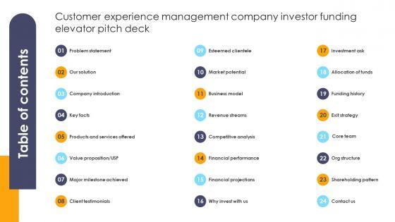 This Table Of Contents Customer Experience Management Company Investor Funding Elevator Pitch Deck is perfect for any presentation, be it in front of clients or colleagues. It is a versatile and stylish solution for organizing your meetings. The Table Of Contents Customer Experience Management Company Investor Funding Elevator Pitch Deck features a modern design for your presentation meetings. The adjustable and customizable slides provide unlimited possibilities for acing up your presentation. Slidegeeks has done all the homework before launching the product for you. So, do not wait, grab the presentation templates today Our Table Of Contents Customer Experience Management Company Investor Funding Elevator Pitch Deck are topically designed to provide an attractive backdrop to any subject. Use them to look like a presentation pro.