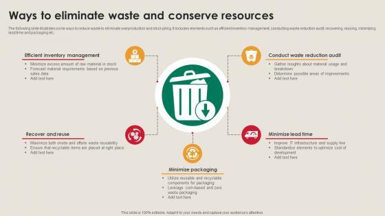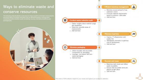 The following slide illustrates some ways to reduce waste to eliminate overproduction and stock piling. It includes elements such as efficient inventory management, conducting waste reduction audit, recovering, reusing, minimizing lead time and packaging etc. Are you searching for a Ways To Eliminate Waste And Conserve Resources Manufacturing Strategy Driving Industry 4 0 that is uncluttered, straightforward, and original Its easy to edit, and you can change the colors to suit your personal or business branding. For a presentation that expresses how much effort you have put in, this template is ideal With all of its features, including tables, diagrams, statistics, and lists, its perfect for a business plan presentation. Make your ideas more appealing with these professional slides. Download Ways To Eliminate Waste And Conserve Resources Manufacturing Strategy Driving Industry 4 0 from Slidegeeks today. The following slide illustrates some ways to reduce waste to eliminate overproduction and stock piling. It includes elements such as efficient inventory management, conducting waste reduction audit, recovering, reusing, minimizing lead time and packaging etc.