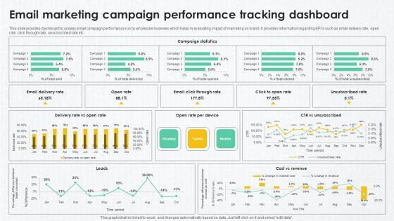 This slide provides dashboard to assess email campaign performance run by wholesale business which helps in evaluating impact of marketing on brand. It provides information regarding KPIs such as email delivery rate, open rate, click through rate, unsubscribed rate etc. Explore a selection of the finest B2B Marketing Techniques Email Marketing Campaign Performance Tracking here. With a plethora of professionally designed and pre-made slide templates, you can quickly and easily find the right one for your upcoming presentation. You can use our B2B Marketing Techniques Email Marketing Campaign Performance Tracking to effectively convey your message to a wider audience. Slidegeeks has done a lot of research before preparing these presentation templates. The content can be personalized and the slides are highly editable. Grab templates today from Slidegeeks. This slide provides dashboard to assess email campaign performance run by wholesale business which helps in evaluating impact of marketing on brand. It provides information regarding KPIs such as email delivery rate, open rate, click through rate, unsubscribed rate etc.