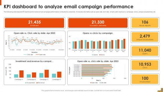 The following slide depicts KPI dashboard to review email campaign performance conducted by university. It includes elements such as open rate, click rate, emails sent, revenue by campaign, clicks, unique unsubscribes, etc. The best PPT templates are a great way to save time, energy, and resources. Slidegeeks have 100 percent editable powerpoint slides making them incredibly versatile. With these quality presentation templates, you can create a captivating and memorable presentation by combining visually appealing slides and effectively communicating your message. Download KPI Dashboard To Analyze Email Campaign Performance Running Marketing Campaigns Strategy SS V from Slidegeeks and deliver a wonderful presentation. The following slide depicts KPI dashboard to review email campaign performance conducted by university. It includes elements such as open rate, click rate, emails sent, revenue by campaign, clicks, unique unsubscribes, etc.