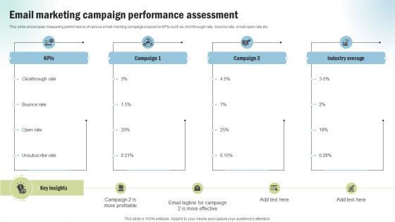 This slide showcases measuring performance of various email marking campaigns based on KPIs such as click through rate, bounce rate, email open rate etc. Coming up with a presentation necessitates that the majority of the effort goes into the content and the message you intend to convey. The visuals of a PowerPoint presentation can only be effective if it supplements and supports the story that is being told. Keeping this in mind our experts created Project Benchmarking Process Email Marketing Campaign Performance Assessment CRP DK SS V to reduce the time that goes into designing the presentation. This way, you can concentrate on the message while our designers take care of providing you with the right template for the situation. This slide showcases measuring performance of various email marking campaigns based on KPIs such as click through rate, bounce rate, email open rate etc.
