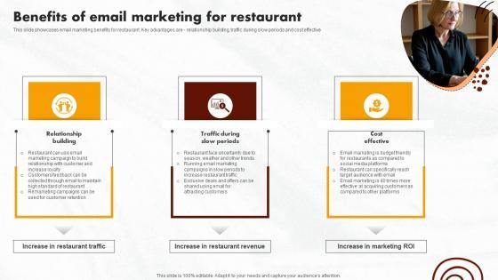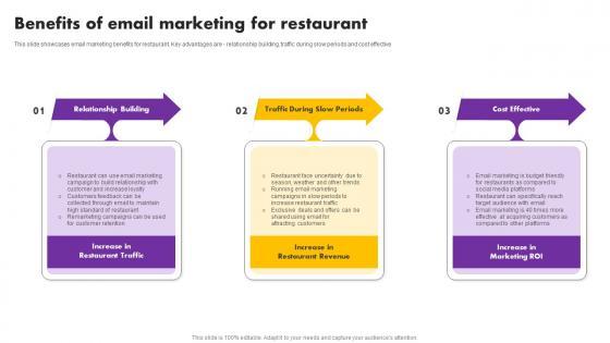 This slide showcases email marketing benefits for restaurant. Key advantages are - relationship building, traffic during slow periods and cost effective.If your project calls for a presentation, then Slidegeeks is your go-to partner because we have professionally designed, easy-to-edit templates that are perfect for any presentation. After downloading, you can easily edit Digital Marketing Plan For Restaurant Business Benefits Of Email Marketing For Restaurant Template PDF and make the changes accordingly. You can rearrange slides or fill them with different images. Check out all the handy templates