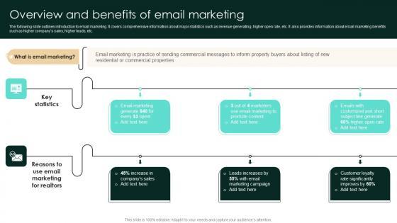 The following slide outlines introduction to email marketing. It covers comprehensive information about major statistics such as revenue generating, higher open rate, etc. It also provides information about email marketing benefits such as higher companys sales, higher leads, etc.Do you have to make sure that everyone on your team knows about any specific topic I yes, then you should give Overview And Benefits Of Email Marketing Real Estate Property Marketing Graphics Pdf a try. Our experts have put a lot of knowledge and effort into creating this impeccable Overview And Benefits Of Email Marketing Real Estate Property Marketing Graphics Pdf. You can use this template for your upcoming presentations, as the slides are perfect to represent even the tiniest detail. You can download these templates from the Slidegeeks website and these are easy to edit. So grab these today. The following slide outlines introduction to email marketing. It covers comprehensive information about major statistics such as revenue generating, higher open rate, etc. It also provides information about email marketing benefits such as higher companys sales, higher leads, etc.