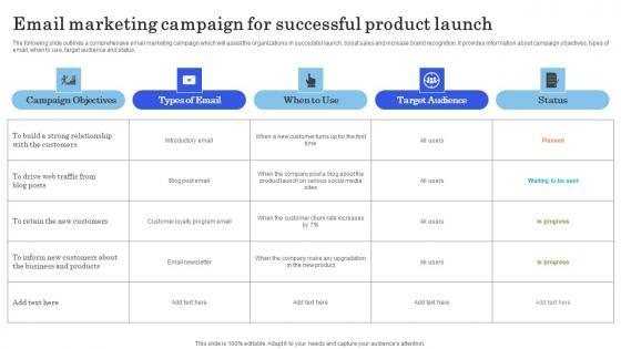 The following slide outlines a comprehensive email marketing campaign which will assist the organizations in successful launch, boost sales and increase brand recognition. It provides information about campaign objectives, types of email, when to use, target audience and status. Explore a selection of the finest Email Marketing Campaign For Successful Product Launch Launching New Beverage Product Structure PDF here. With a plethora of professionally designed and pre-made slide templates, you can quickly and easily find the right one for your upcoming presentation. You can use our Email Marketing Campaign For Successful Product Launch Launching New Beverage Product Structure PDF to effectively convey your message to a wider audience. Slidegeeks has done a lot of research before preparing these presentation templates. The content can be personalized and the slides are highly editable. Grab templates today from Slidegeeks.