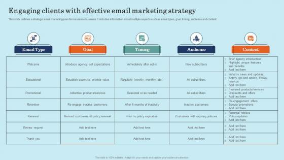 This slide outlines a strategic email marketing plan for insurance business. It includes information about multiple aspects such as email types, goal, timing, audience and content.Present like a pro with Engaging Clients With Effective Email Marketing Effective General Insurance Marketing Infographics Pdf Create beautiful presentations together with your team, using our easy-to-use presentation slides. Share your ideas in real-time and make changes on the fly by downloading our templates. So whether you are in the office, on the go, or in a remote location, you can stay in sync with your team and present your ideas with confidence. With Slidegeeks presentation got a whole lot easier. Grab these presentations today. This slide outlines a strategic email marketing plan for insurance business. It includes information about multiple aspects such as email types, goal, timing, audience and content.