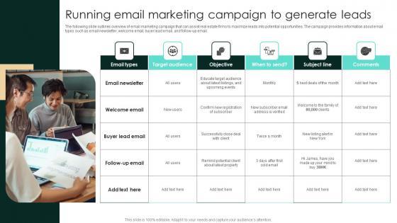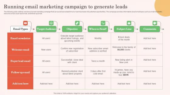 The following slide outlines overview of email marketing campaign that can assist real estate firms to maximize leads into potential opportunities. The campaign provides information about email types such as email newsletter, welcome email, buyer lead email, and follow-up email.Crafting an eye-catching presentation has never been more straightforward. Let your presentation shine with this tasteful yet straightforward Running Email Marketing Campaign To Generate Leads Real Estate Property Marketing Structure Pdf template. It offers a minimalistic and classy look that is great for making a statement. The colors have been employed intelligently to add a bit of playfulness while still remaining professional. Construct the ideal Running Email Marketing Campaign To Generate Leads Real Estate Property Marketing Structure Pdf that effortlessly grabs the attention of your audience. Begin now and be certain to wow your customers. The following slide outlines overview of email marketing campaign that can assist real estate firms to maximize leads into potential opportunities. The campaign provides information about email types such as email newsletter, welcome email, buyer lead email, and follow-up email.