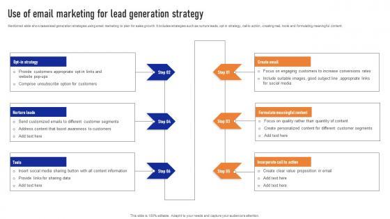 Mentioned slide showcases lead generation strategies using email marketing to plan for sales growth. It includes strategies such as nurture leads, opt in strategy, call to action, creating mail, tools and formulating meaningful content. Pitch your topic with ease and precision using this Use Of Email Marketing For Lead Generation Strategy Ppt Infographic Template Tips Pdf. This layout presents information on Nurture Leads, Opt In Strategy, Call To Action. It is also available for immediate download and adjustment. So, changes can be made in the color, design, graphics or any other component to create a unique layout. Mentioned slide showcases lead generation strategies using email marketing to plan for sales growth. It includes strategies such as nurture leads, opt in strategy, call to action, creating mail, tools and formulating meaningful content.
