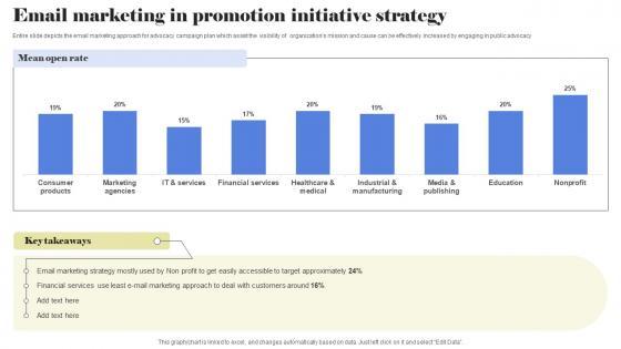 Entire slide depicts the email marketing approach for advocacy campaign plan which assist the visibility of organizations mission and cause can be effectively increased by engaging in public advocacy Showcasing this set of slides titled Email Marketing In Promotion Initiative Strategy Formats Pdf The topics addressed in these templates are Easily Accessible, Target Approximately, Marketing Approach All the content presented in this PPT design is completely editable. Download it and make adjustments in color, background, font etc. as per your unique business setting. Entire slide depicts the email marketing approach for advocacy campaign plan which assist the visibility of organizations mission and cause can be effectively increased by engaging in public advocacy.