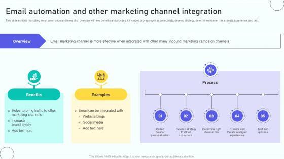 This slide exhibits marketing email automation and integration overview with key benefits and process. It includes process such as collect data, develop strategy, determine channel mix, execute experience, and test. Find highly impressive Email Marketing Automation Process Email Automation And Other Marketing Channel on Slidegeeks to deliver a meaningful presentation. You can save an ample amount of time using these presentation templates. No need to worry to prepare everything from scratch because Slidegeeks experts have already done a huge research and work for you. You need to download Email Marketing Automation Process Email Automation And Other Marketing Channel for your upcoming presentation. All the presentation templates are 100 percent editable and you can change the color and personalize the content accordingly. Download now This slide exhibits marketing email automation and integration overview with key benefits and process. It includes process such as collect data, develop strategy, determine channel mix, execute experience, and test.