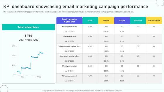 This slide presents email marketing dashboard that track the health and success rate of multiple campaigns. It includes common email metrics such as open rate, sent, bounces, open rate, etc. Welcome to our selection of the Email Marketing Automation Process KPI Dashboard Showcasing Email Marketing. These are designed to help you showcase your creativity and bring your sphere to life. Planning and Innovation are essential for any business that is just starting out. This collection contains the designs that you need for your everyday presentations. All of our PowerPoints are 100 percent editable, so you can customize them to suit your needs. This multi-purpose template can be used in various situations. Grab these presentation templates today. This slide presents email marketing dashboard that track the health and success rate of multiple campaigns. It includes common email metrics such as open rate, sent, bounces, open rate, etc.