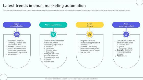 This slide covers recent trends in email marketing automation aimed at increasing organization revenue. These trends include hyper-personalization, micro-segmentation, email designs, and user-generated content. Explore a selection of the finest Email Marketing Automation Process Latest Trends In Email Marketing Automation here. With a plethora of professionally designed and pre-made slide templates, you can quickly and easily find the right one for your upcoming presentation. You can use our Email Marketing Automation Process Latest Trends In Email Marketing Automation to effectively convey your message to a wider audience. Slidegeeks has done a lot of research before preparing these presentation templates. The content can be personalized and the slides are highly editable. Grab templates today from Slidegeeks. This slide covers recent trends in email marketing automation aimed at increasing organization revenue. These trends include hyper-personalization, micro-segmentation, email designs, and user-generated content.