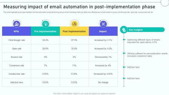 This slide highlights post implementation of email automation aimed at tracking various email marketing metrics to determine effectiveness of automation. It covers click through rate, open rate, unsubscribe rate, etc. The best PPT templates are a great way to save time, energy, and resources. Slidegeeks have 100 percent editable powerpoint slides making them incredibly versatile. With these quality presentation templates, you can create a captivating and memorable presentation by combining visually appealing slides and effectively communicating your message. Download Email Marketing Automation Process Measuring Impact Of Email Automation from Slidegeeks and deliver a wonderful presentation. This slide highlights post implementation of email automation aimed at tracking various email marketing metrics to determine effectiveness of automation. It covers click through rate, open rate, unsubscribe rate, etc.